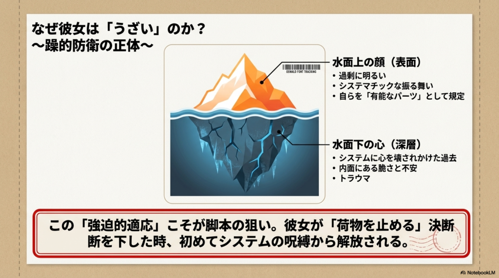 彼女は赴任前の休職期間が示す通り、かつてシステムに心を壊されかけた過去があります。あえて過剰に明るく、システマチックに振る舞うことで、自らの内面にある脆さや不安を隠し、自分を「有能なパーツ」として規定し続けていたのです。