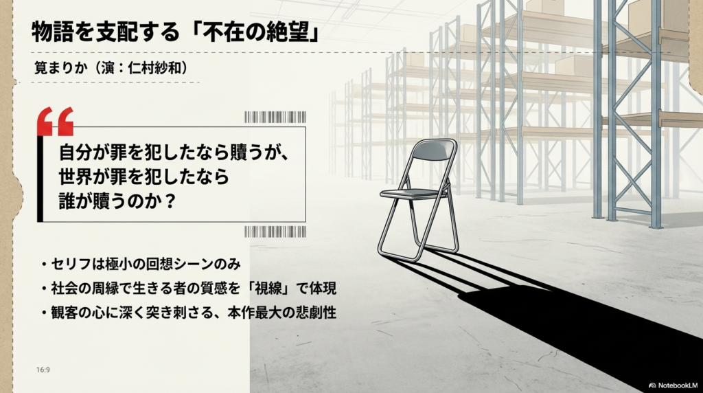 仁村紗和さんが演じた「不在の絶望」から、満島ひかりさんが体現した「躁的適応」、そして佐野親子が示した「労働の矜持」まで、一人ひとりが現代社会の「部品」ではなく「人間」であることを証明した点にあります。人間を数字で見る世界への、強烈なカウンターパンチですよ。