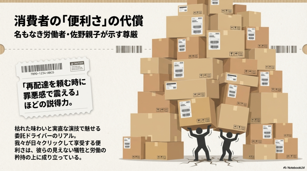 配送を担う佐野親子の姿は、現代の物流が抱える歪みそのものです。「1個150円なんて安すぎる」というセリフの重み。